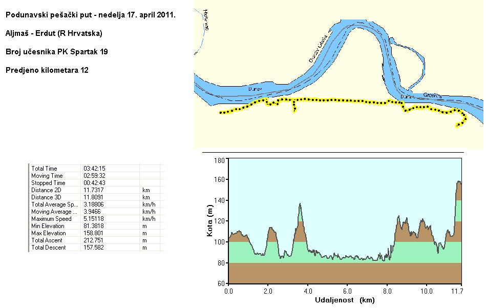 Na poziv HPD Zanatlija Osijek u nedelju 17. aprila smo učestovali na akciji Podunavski pešački put koja se tradicionalno održava nedelju dana pre Uskrsa. Podunavski pešački put je osmišljen sa ciljem da posetioci uoče bogatstvo i raznolikost ponude koje čoveku pruža pešačenje ovim područjem. Prelazak celog puta traje oko 6 sati. Polazno mesto ovogodišnjeg susreta je Aljmaš na obali Dunava gde se okupilo preko 300 planinara iz Hrvatske, BiH i Srbije. U Aljmaš smo stigli sa desetak minuta kašnjenja zbog malog zastoja na graničnom prelazu ali su ljubazni domaćini pomerili satnicu planiranog programa pa smo najpre mogli da uživamo u kraćoj plovidbi Dunavom do ušća Drave. Po povratku smo do početka pešačke ture imali dovoljno vremena i da obidjemo ostale znamenitosti Aljmaša.